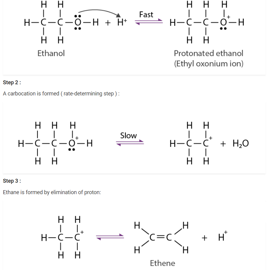 The mechanism of acid dehydration of ethanol to yield ethene involves the following three steps :