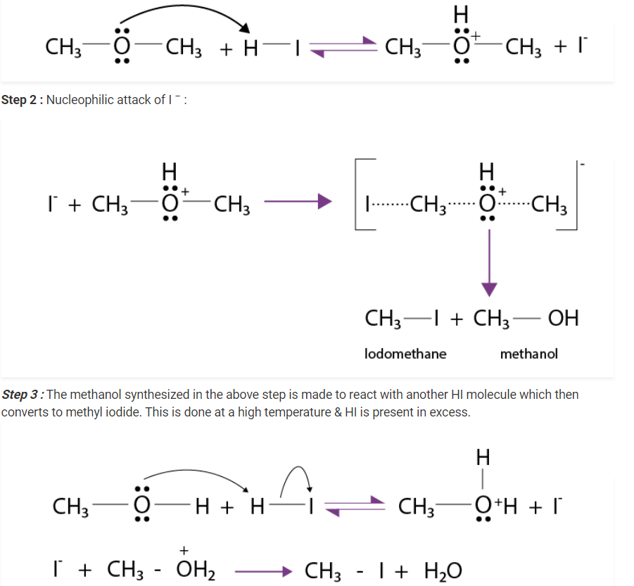The steps of the reaction of methoxymethane with HI are given below :