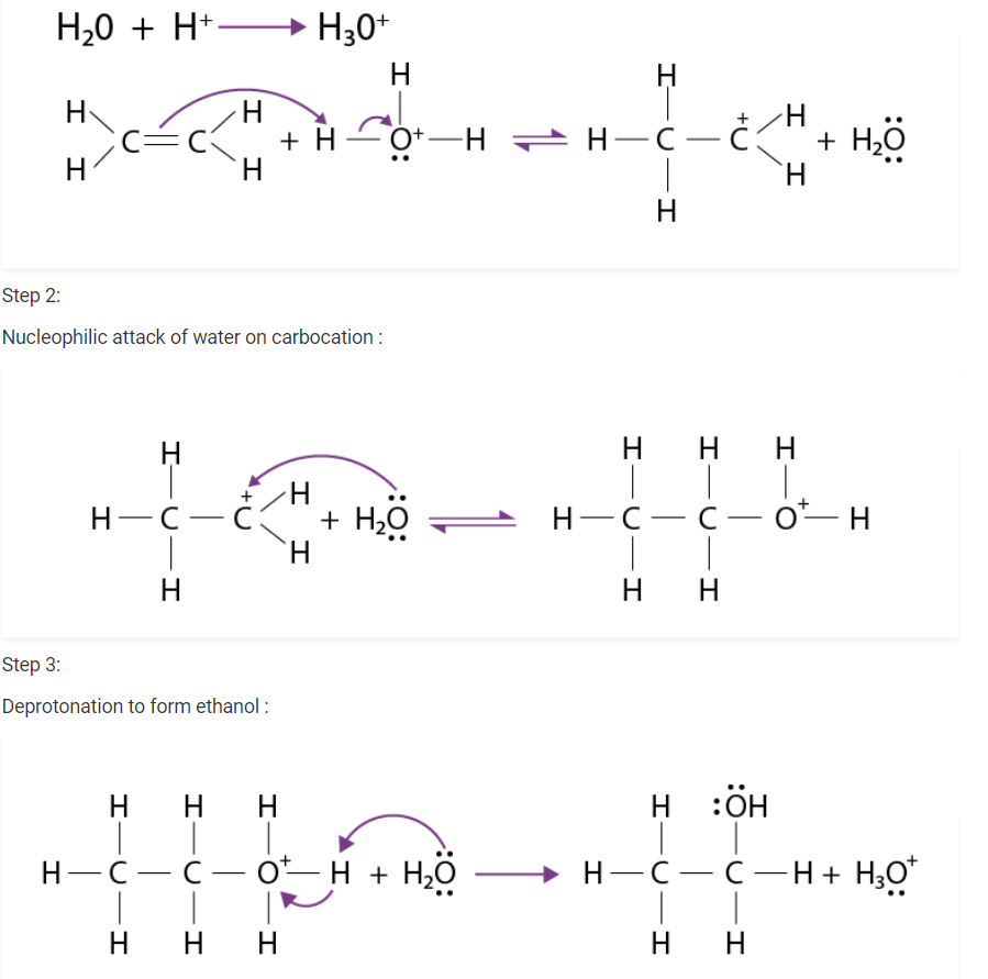 There are three steps that are involved in the mechanism of hydration of ethene to form ethanol. these steps are as follows: