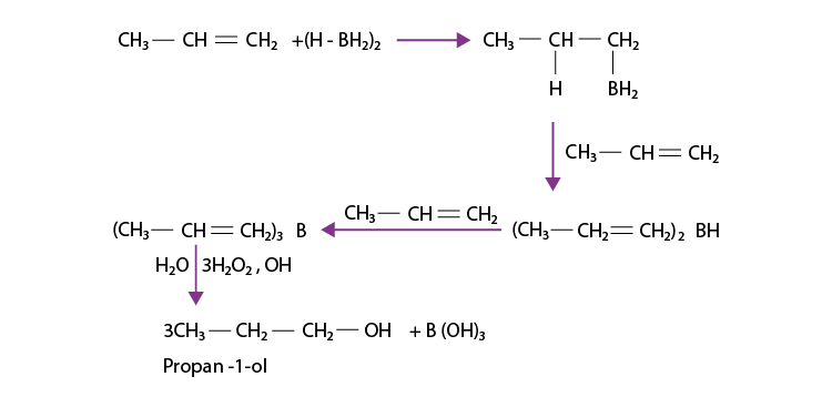 The hydroboration – oxidation reaction is the reaction where borane is added in order for the oxidation to take place. For example, propan – 1 – ol is formed by making propene undergo the hydroboration – oxidation reaction. In the above reaction, the reaction between propene and diborane ( BH 3 )2 takes place in order to form trialkyl borane which acts an additional product. This additional product is oxidized to alcohol by hydrogen peroxide in the presence of aqueous sodium hydroxide.