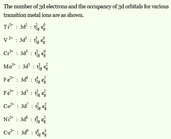 Write down the number of 3d electrons in each of the following ions: Ti2+, V2+, Cr3+, Mn2+, Fe2+, Fe3+, CO2+, Ni2+ and Cu2+. Indicate how would you expect the five 3d orbitals to be occupied for these hydrated ions (octahedral).