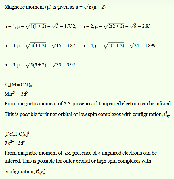 (i) Paramagnetism arises from the presence of unpaired electrons, each such electron has magnetic moment associated with its spin angular momentum and orbital angular momentum. For the compounds of the first series of transition metals, the contribution of the orbital angular momentum is effectively quenched and hence is of no significance. For these, the magnetic moment,is determined by the number of unpaired electrons and is calculated by using the ‘spin’ only’ formula, i.e., µ = B.M