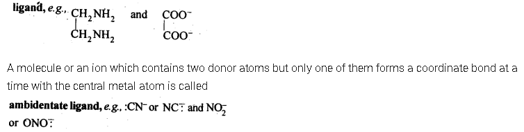 Ans: A molecule or an ion which has only one donor atom to form one coordinate bond with the central metal atom is called unidentate ligand, e.g,, Cl- and NH3.
