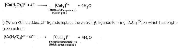 9.13. Aqueous copper sulphate solution (blue in colour) gives: (i) a green precipitate with aqueous potassium fluoride and (ii)a bright green solution with aqueous potassium chloride. Explain these experimental results.