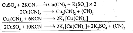 Ans: First cupric cyanide is formed which decomposes to give cuprous cyanide and cyanogen gas. Cuprous cyanide dissolves in excess of potassium cyanide to form the complex, K3[Cu(CN)4],