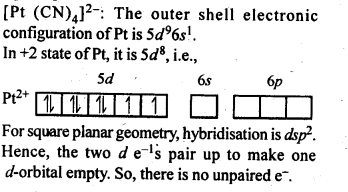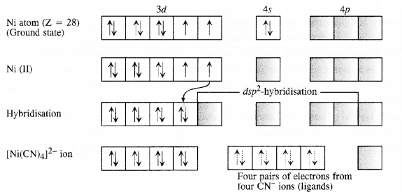 Ans: Outer electronic configuration of nickel (Z = 28) in ground state is 3d84s2. Nickel in this complex is in + 2 oxidation state. It achieves + 2 oxidation state by the loss of the two 4s-electrons. The resulting Ni2+ ion has outer electronic configuration of 3d8. Since CN– ion is a strong field, under its attacking influence, two unpaired electrons in the 3d orbitals pair up.