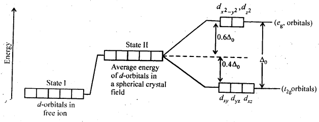 Ans: When the ligands approach a transition metal ion, the d-orbitals split into two sets, one with lower energy and the other with higher energy. The difference of energy between the two sets of orbitals is called crystal field splitting energy (Δ0 for octahedral field). If Δ0 < P (pairing energy), the fourth electron enters