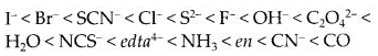 Ans: The crystal field splitting, ∆0, depends upon the field produced by the ligand and charge on the metal ion. Some ligands are able to produce strong fields in which, the splitting will be large whereas others produce weak fields and consequently result in small splitting of d-orbitals. In general, ligands can be arranged in a series in the order of increasing field strength as given below :