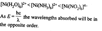 Ans: As metal ion is fixed, the increasing field strengths, i.e., the CFSE values of the ligands from the spectro-chemical series are in the order: H20<NH3< NO2–;