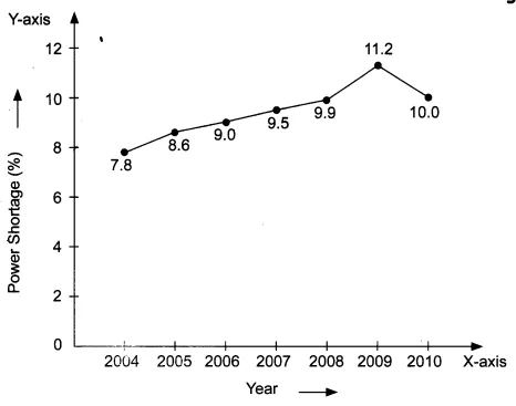 The following table shows the total power shortage in India from 2004-2010. Show the data in the form of a graph. Piet shortage percentage for the years on the y-axis and the year on the x-axis.