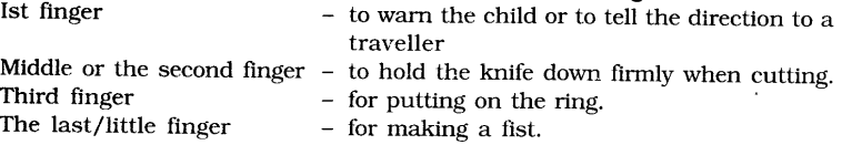 B. Look at your hands carefully. Now, write down for each finger one action for which that finger is particularly important. For example, the second (or index) finger helps to hold the knife down firmly when cutting.