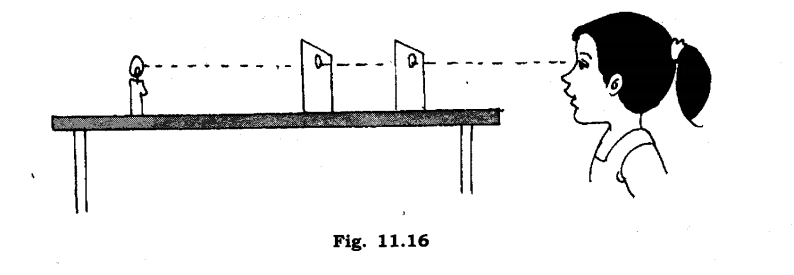 Ans:Â We take three pieces of cardboard. Place them one on the top of one another and make a hole in the middle of each cardboard by using a thick nail. Erect these cards up on the table at a short distance away from each other. Take a candle which is of the same height as the holes in the cards. Light the candle and place it in front of the cards. We see that the light of candle is visible only when the holes on cards lie in a straight line. If we disturb them the light of candle disappears. This experiment shows that light propagates in a straight line.