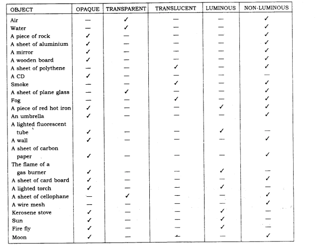 Air, water, a piece of rock, a sheet of aluminium, a mirror, a wooden board, a sheet of polythene, a CD, smoke, a sheet of plane glass, fog, a piece of red hot iron, an umbrella, a lighted fluorescent tube, a wall, a sheet of carbon paper, the fame of a gas burner, a sheet of cardboard, a lighted torch, a sheet of cellophane, a wire mesh, kerosene stove, sun, firefly, moon.