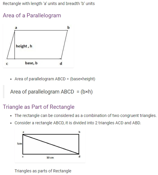 - Perimeter of a rectangle = l + l + b + b = 2(l + b), where l and b are length and breadth, respectively.