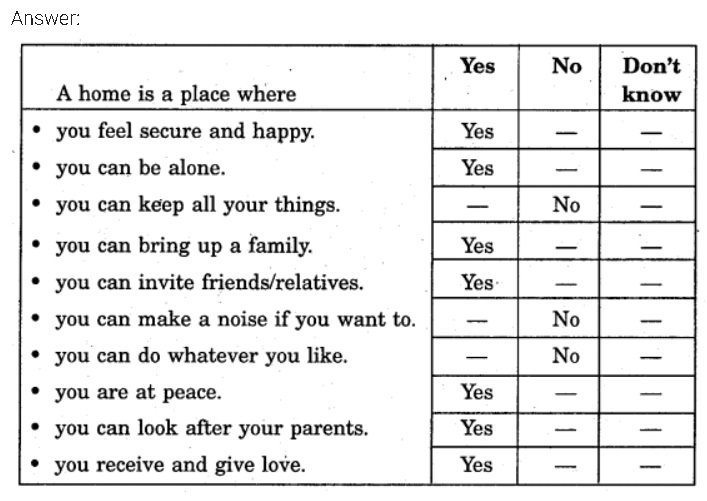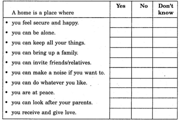 On the basis of your meeting people and filling the questionnaire, you will be able to analyse the results by asking these questions. I think mostly people will say that a home is a place you feel secure and happy.