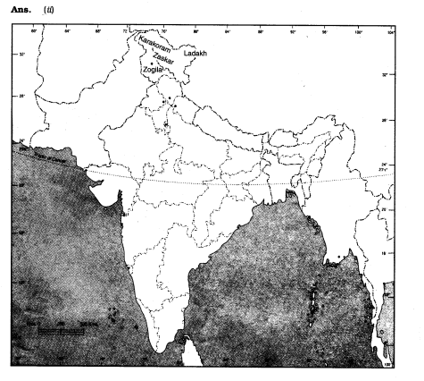 (ii) On the outline map of India, mark the Karakoram Range, Zanskar Range, Ladakh and zojila pass.