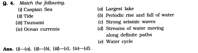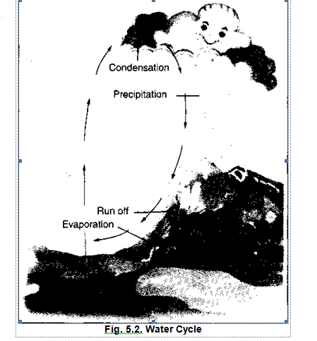 Ans. The sun’s heat causes evaporation of water, flowing down to stream or drains into water vapour. When the water vapour cools down, it condenses and forms clouds. These clouds, when become too heavy to float, start falling on the land or sea in the form of rain, snow, or sleet. Thus, the process by which water continually changes its form and circulates between oceans, atmosphere, and land is known as the water cycle.