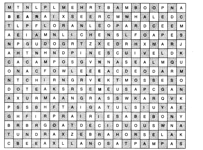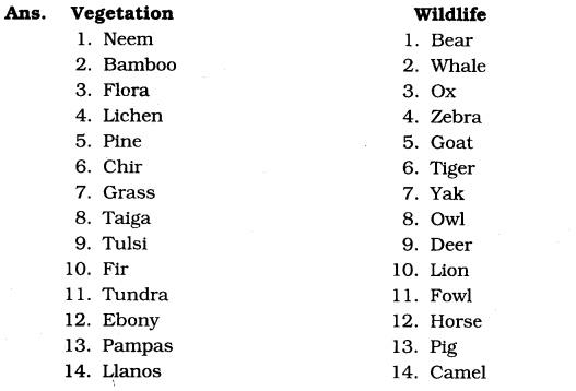 In the crossword table given below, some words are hidden. They are all about vegetation and wildlife and are to be found horizontally and vertically. Two have been worked out for you. Work in pairs with a friend