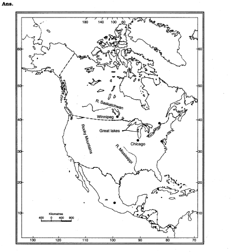 On an outline map of North America, mark the Rocky mountains, the Great Lakes, River Mississippi, River Saskatchewan, the cities—Chicago and Winnipeg.
