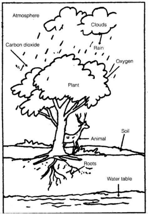 clouds, rain, atmosphere, carbon dioxide, oxygen, plants, animals, soil, roots, water table.