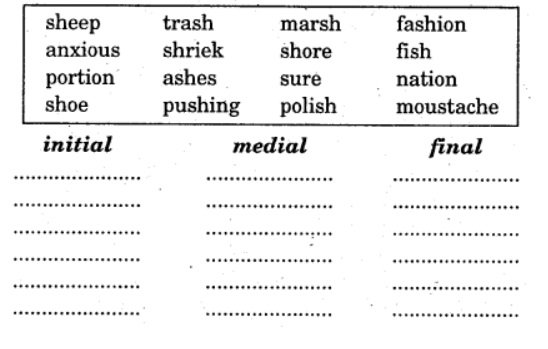 Each of the following words contains the sound ‘sh’ (as in shine) in the beginning or in the middle or at the end. First speak out all the words clearly.. Then arrange the words in three groups in the table below.